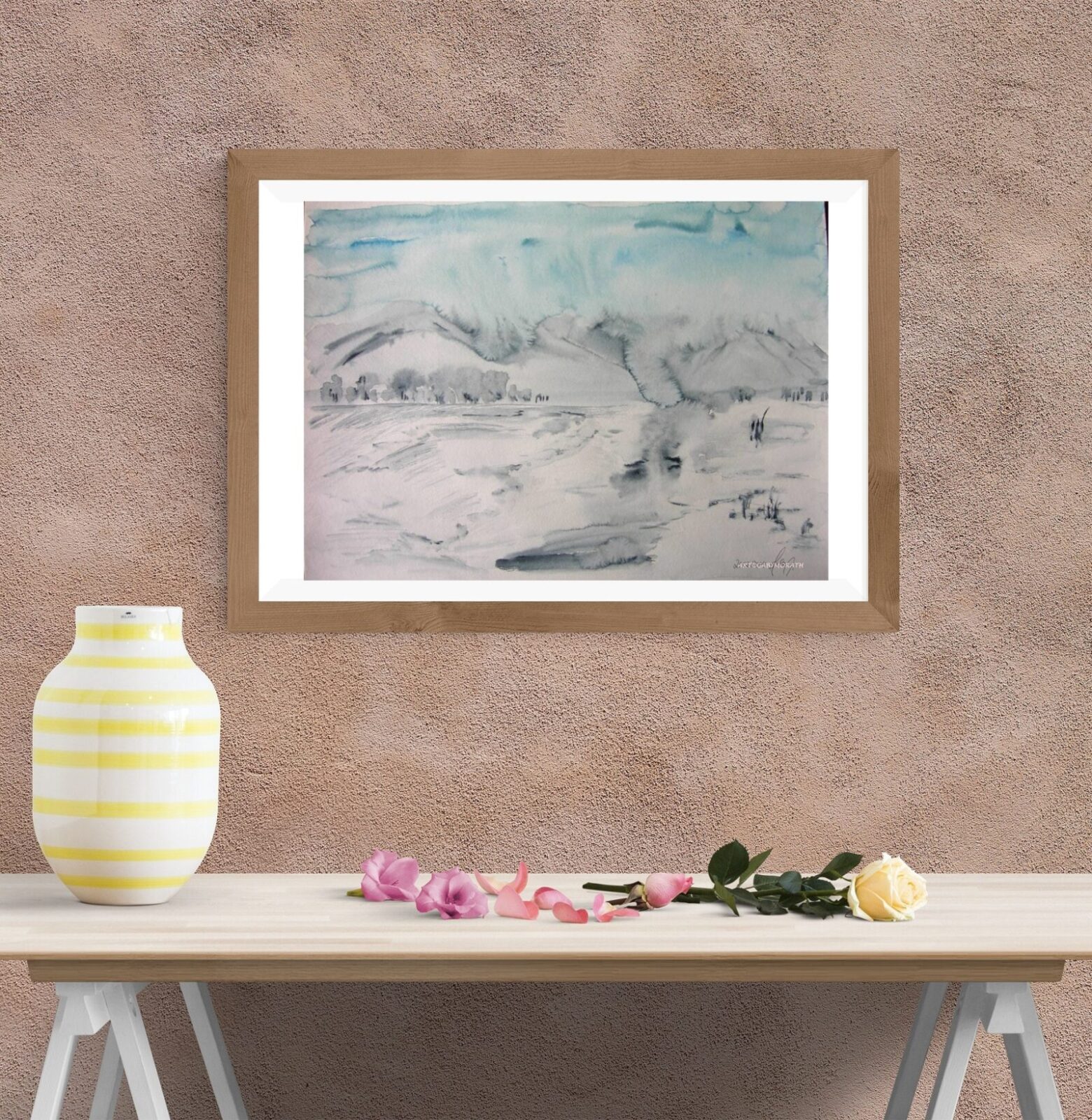 Einzigartige Ästhetik: Das Aquarell vereint meisterhaft die Schönheit des Winters mit der Frische der handgemalten Kunst.